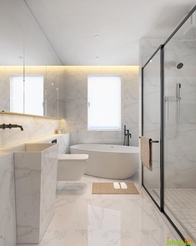 室內(nèi)設(shè)計(jì)師在主衛(wèi)的門做了窄邊黑色金屬框,同時(shí)延續(xù)的門廳的藝術(shù)玻璃,墻面做了一整面酒柜,看上去簡(jiǎn)潔大氣,同時(shí)又兼具充足收納。