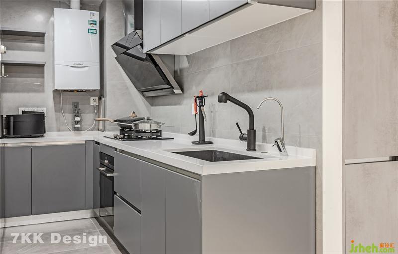 L字造型廚房,操作臺非常重要根據(jù)需求的高度進行設(shè)計,否則會造成靈活困擾。淺灰色的鋪設(shè)更注重開放性、冷色調(diào)。給人一種清爽的感覺,減少了不必要的裝飾線條,水槽采用石英石的水斗,旁邊的不銹鋼水管可以直接供應(yīng)給客人直飲水。烤箱按在了下面,微波爐選用可移動式,抽屜式的廚門放置碗具。