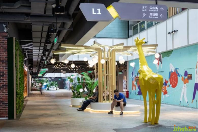 設(shè)計(jì)師應(yīng)該在內(nèi)外尺度中與商業(yè)和公共區(qū)域的關(guān)懷找到平衡點(diǎn)。商場設(shè)計(jì)公園街以色彩明麗造型極簡為主,加以綠植點(diǎn)綴,讓整個(gè)空間氛圍變得清新和靈動(dòng)。