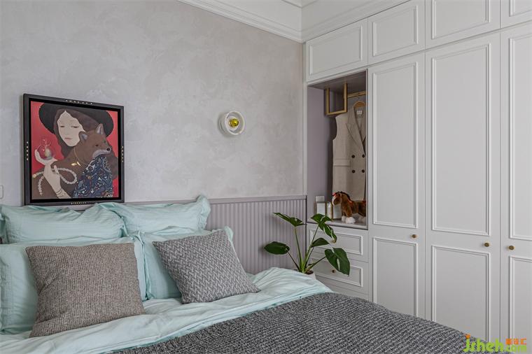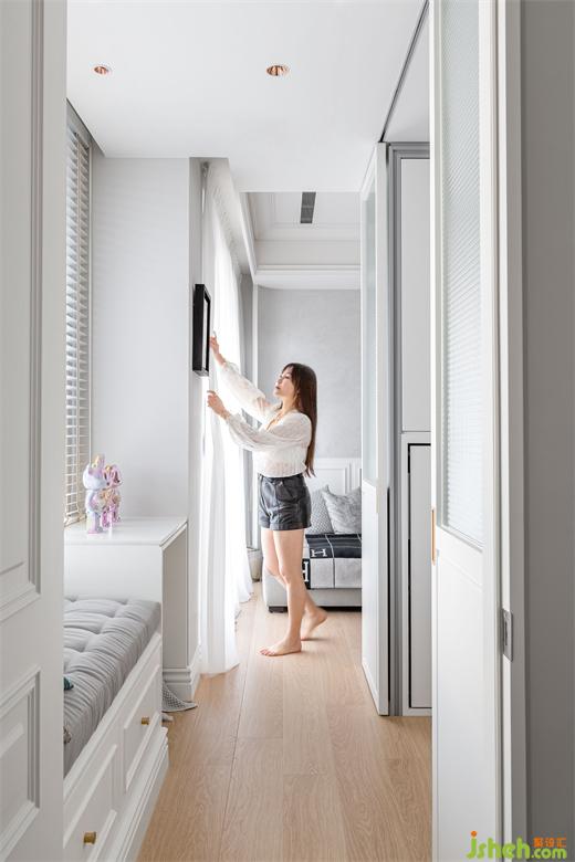 在室內(nèi)18坪的空間里,除了浴室是原有的建商隔間墻以外,兩房?jī)蓮d不但沒(méi)有使用傳統(tǒng)的隔間墻面,而是采用玻璃拉門(mén)結(jié)合木作造型柜體,家裝設(shè)計(jì)將收納最大化之外,同時(shí)也提供必要的隱私。客廳后方與更衣室的隔間,是表情豐富的柜體,一面是客廳展示柜,另一面是更衣室的掀床與衣物收納。面對(duì)單面的落地采光,避免阻礙光線隔斷,使用長(zhǎng)虹玻璃拉門(mén)創(chuàng)造出回字型動(dòng)線。