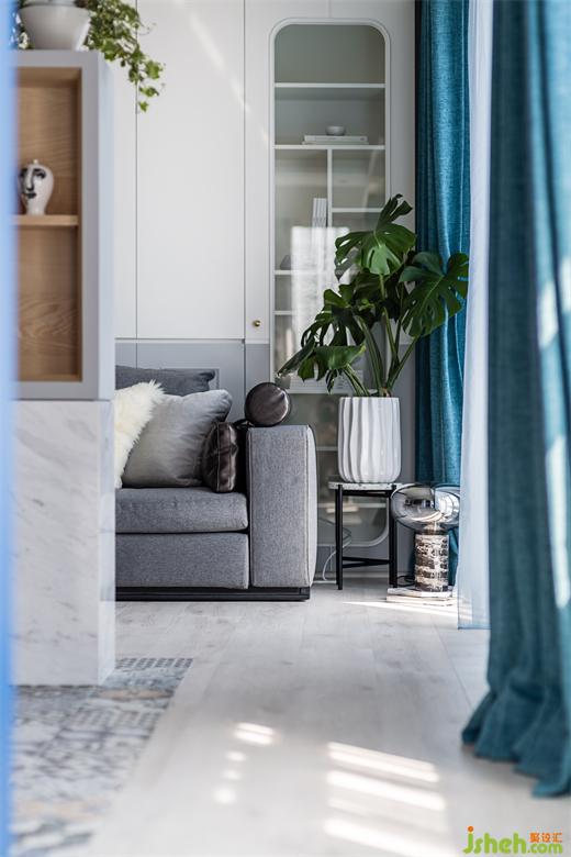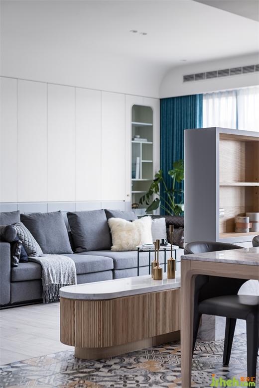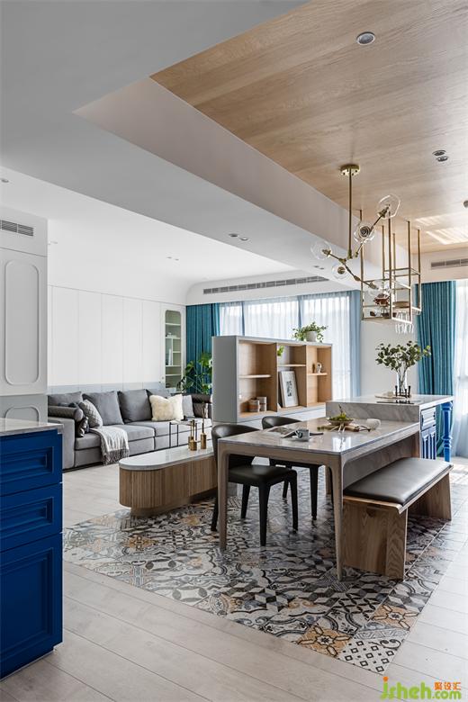 客廳與餐廳原為同一個開放公共空間區(qū),設計團隊以餐廳為視覺焦點,地板鋪設磨石子花磚,彷彿是一片大地毯,從餐廳下方擴散到半高的電視墻,將豐富的餐廳色彩延伸至客廳。電視柜刻意做一高一低,降低入門口的視覺壓迫。