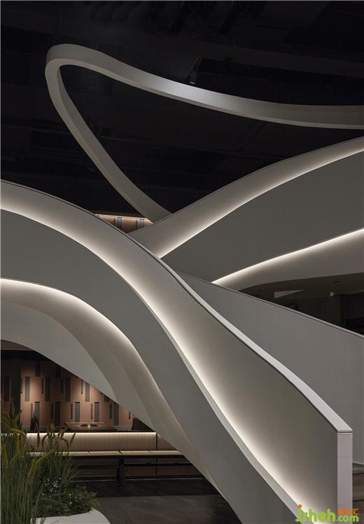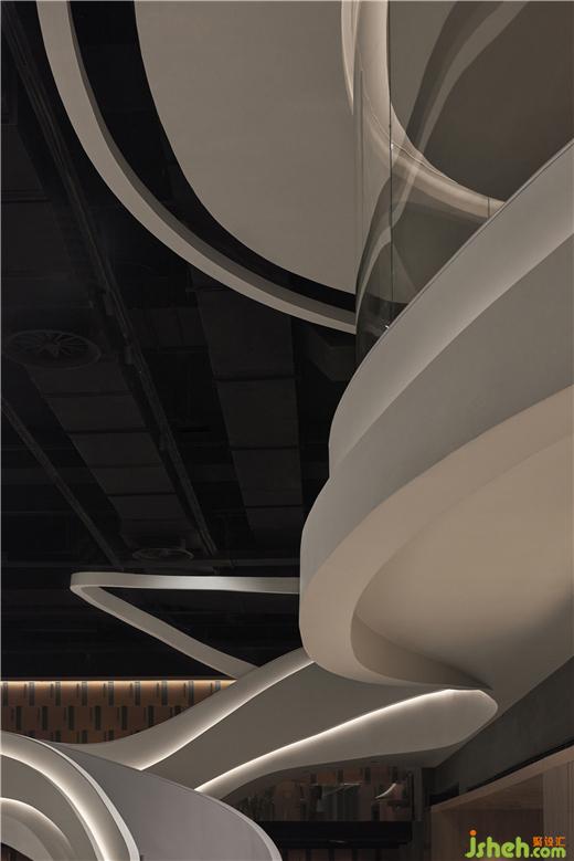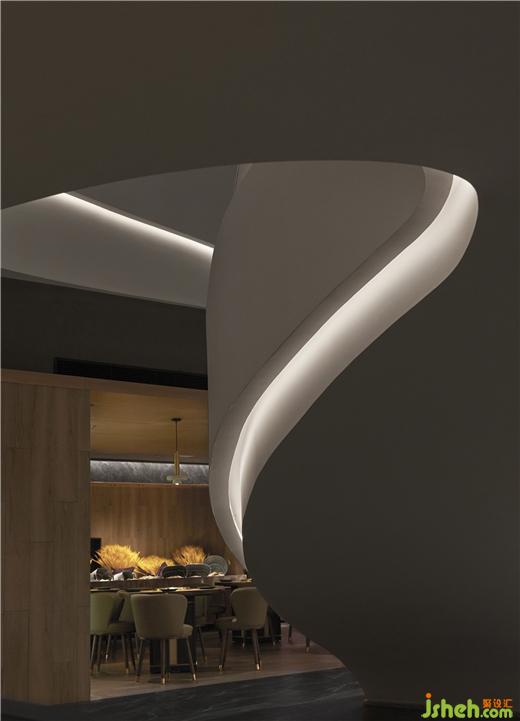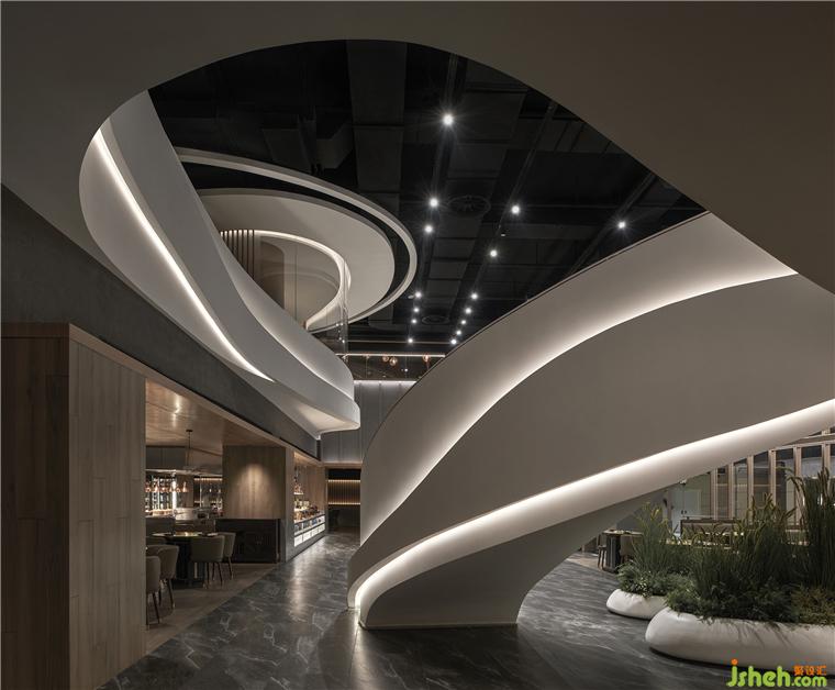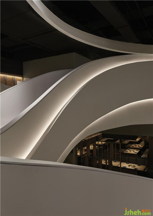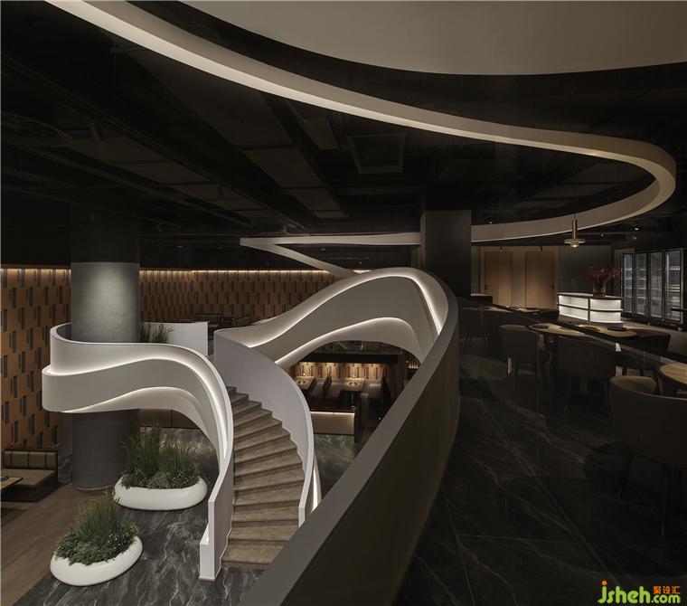 規(guī)整的空間內(nèi),一道扶搖而上的白色樓梯成為空間中的視覺重點(diǎn),自由流暢的曲線好似連綿的山脈。自助烤肉PLUS設(shè)計(jì)軟化了空間單一的直線構(gòu)成的同時(shí)也呼應(yīng)了品牌理念。