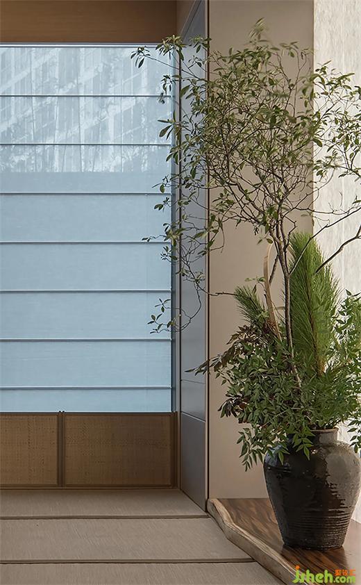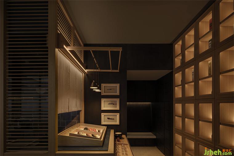 食客穿行至開(kāi)闊的大堂之處,從天花上懸掛下來(lái)的金色裝置映入眼簾,仿佛如初見(jiàn)水中倒映的金閣寺一般。裝置來(lái)自京都傳統(tǒng)的鍛金工藝精心制作而成,自然的紋理賦予了其古樸的質(zhì)地,又非一味的文化符號(hào)挪用,僅以簡(jiǎn)約的線(xiàn)條抽象描摹,強(qiáng)調(diào)出現(xiàn)代性的輪廓感,寥寥數(shù)筆就將這靜謐與遁世離俗的氣質(zhì)渲染,仿佛有來(lái)自原野的風(fēng)、搖曳的枝葉和濕潤(rùn)苔蘚的氣息都剎那間涌了進(jìn)來(lái)。