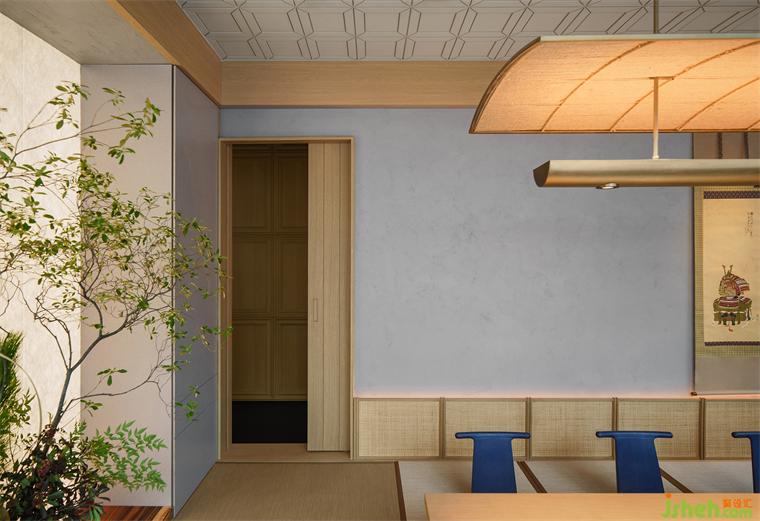 空間中還有很多與“紙”相關(guān)的元素讓立面有了生機(jī)和呼吸感。大廳中設(shè)計(jì)師基于對傳統(tǒng)和風(fēng)紋飾的吸收而原創(chuàng)的壁紙也恰到好處的為整體氛圍鋪陳。包廂中透光的杜邦紙搭配前方的植物,更有如山本梅逸的純墨色卷軸畫一般的風(fēng)骨。一窗之隔的室外是車水馬龍,室內(nèi)幽篁疏影,在方寸之間就能有了自然轉(zhuǎn)換的遠(yuǎn)近空間與細(xì)膩有致的層次布局。