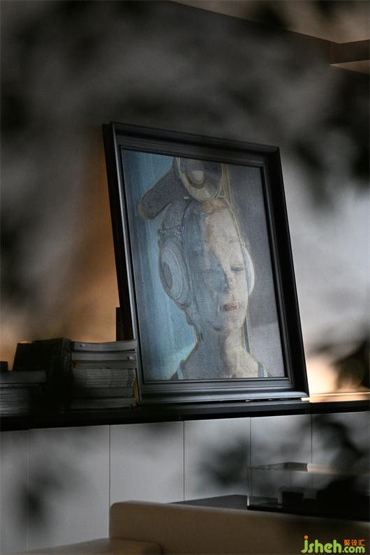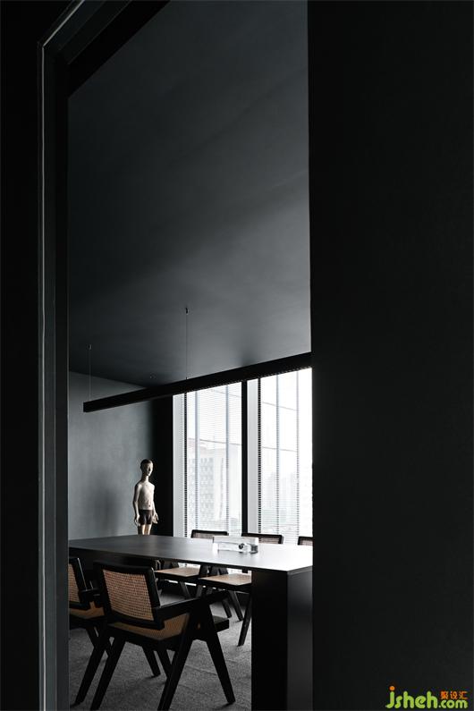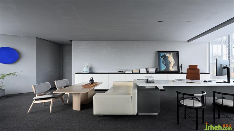 In the planar layout, the white sofaleans against the horizontally extended desk in an unconventional way, which formsthe structure of the middle island. This not only clarifies the spatial order but also leaves adequate spacefor movinglines for the entrance.