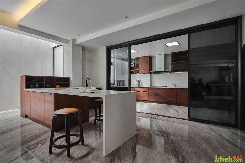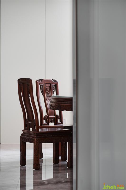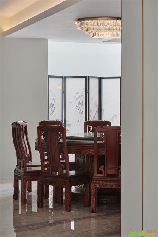 餐廳南面白色墻板設(shè)計了酒窖的隱藏門