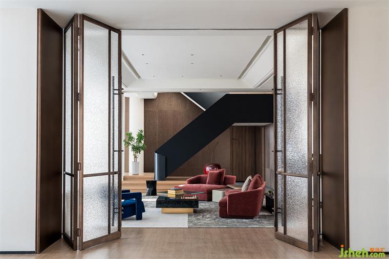 Once interconnected, each independent space has a clear function, with circulation paths linking different functional modules, expanding into multiple composite spaces. They overlap and are used together. The office area, lounge area, and tea area make up a narrow space group along the windows. The Western dining area, Chinese dining area, and lounge area are situated on the northern side in opposition. North and south spatial groups are interconnected through intersecting walls, sliding doors, low TV walls, and electronic fireplaces, facilitating an internal network of multi-use, and versatile space organization.