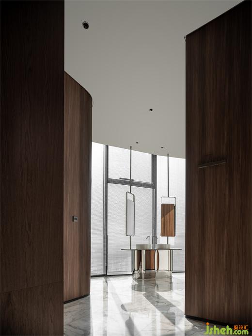 同時(shí),內(nèi)部的墻體結(jié)構(gòu)柔軟地彎折、包覆,時(shí)而傾斜旋轉(zhuǎn),時(shí)而阻斷又接續(xù),它們著力于刻畫連貫、開放與流動(dòng),接待空間設(shè)計(jì)由此衍生出獨(dú)特豐富的空間細(xì)節(jié),同時(shí)也是神秘模糊、令人悸動(dòng)的勾勒。