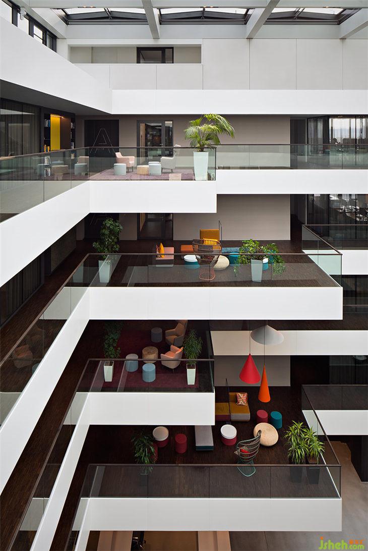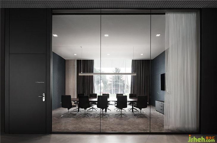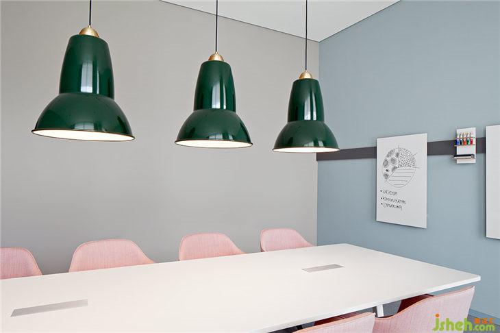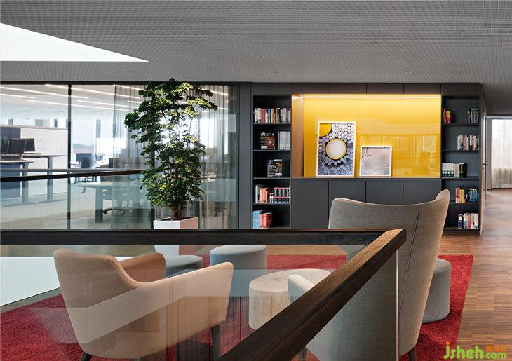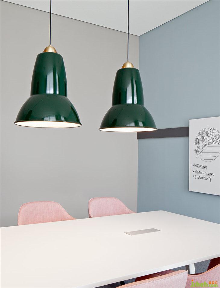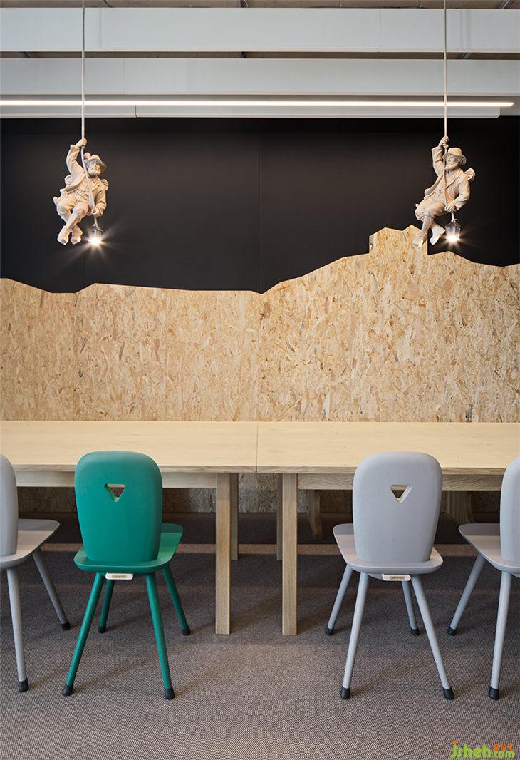 AEB總部每一層都有一個(gè)主題房間,這些可用于進(jìn)行大型會(huì)議或進(jìn)行更為深入的團(tuán)隊(duì)工作。吧臺(tái)椅放置在松軟的地毯上,與落地?zé)艉托还裣嘟Y(jié)合,讓這間會(huì)議室轉(zhuǎn)變成‘思想起居室’。會(huì)議室中紅色的大象雕塑看似突兀,但它鼓勵(lì)參與者可以發(fā)揮充分地創(chuàng)意和想象。四層角落的長(zhǎng)椅和復(fù)古風(fēng)格的椅子等傳統(tǒng)家具在簡(jiǎn)約又現(xiàn)代的裝修環(huán)境中創(chuàng)造了一個(gè)樸實(shí)但并不保守的工作氛圍。一個(gè)大型工作臺(tái)和裝飾吊頂與獨(dú)特設(shè)計(jì)的吊燈相結(jié)合,讓冰冷的會(huì)議室變成一個(gè)活躍的靈感源泉。旁邊的‘?dāng)?shù)字化實(shí)驗(yàn)室’則是為科技愛好者提供的用來(lái)測(cè)試領(lǐng)先技術(shù)、進(jìn)行研究、3D打印以及展示VR技術(shù)的場(chǎng)所。