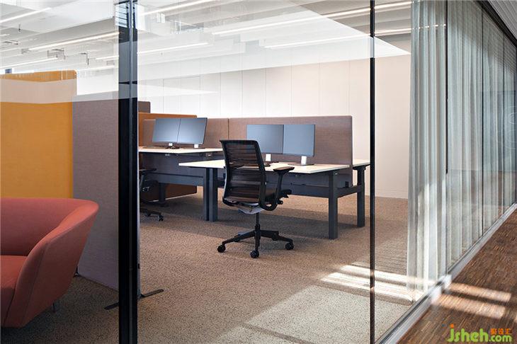 雖然所有員工的工作空間都是開放的,但他們?cè)谝鹿穸紦碛歇?dú)立的儲(chǔ)物箱可以放置個(gè)人物品。AEB的員工也可以根據(jù)個(gè)人喜好選擇不同工作區(qū)域:可調(diào)高度的工作臺(tái)、站立式工作臺(tái)以及可放置多臺(tái)電腦的常規(guī)辦公臺(tái)面。大型辦公室中的壁龕提供更私密的角落,幫助營(yíng)造一個(gè)舒適的氛圍。斜對(duì)角的A和B辦公室被分配了黃色和藍(lán)色的主色調(diào),以便員工更快、更準(zhǔn)確地找到方向。