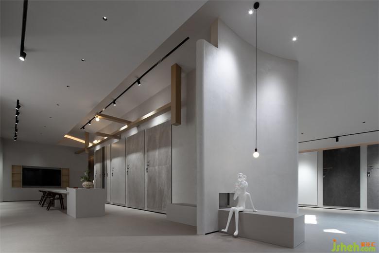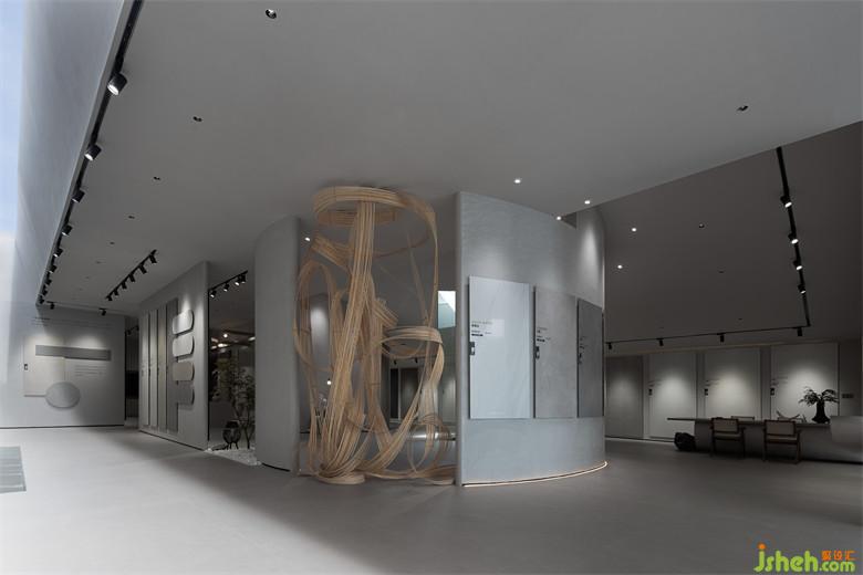 二層空間延續(xù)其他場(chǎng)域的布展形式,瓷磚展廳設(shè)計(jì)讓多元化產(chǎn)品以成系列的方式展示,空間的界限被打破,便于進(jìn)一步探索內(nèi)與外、人與物的關(guān)系。置入藝術(shù)裝置,為藝術(shù)和自然精神的相互滲透提供了切入點(diǎn)。