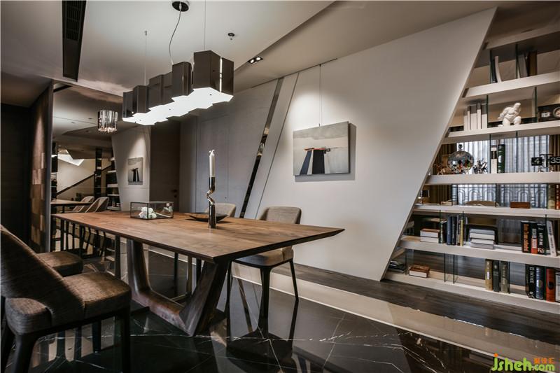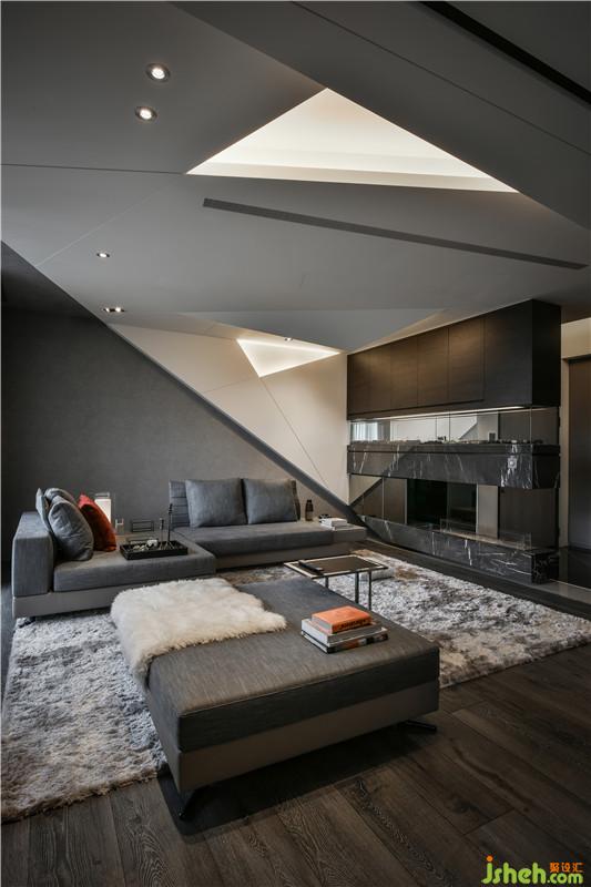 傾斜且富線條變化的天花板與墻面走勢(shì),結(jié)合著各種光線的折射,而帶給屋內(nèi)極富設(shè)計(jì)感的生動(dòng)氣質(zhì),與此同時(shí)也透過(guò)在個(gè)線條中的巧妙規(guī)畫,一舉結(jié)合了收納、展示、生活實(shí)用與空間美學(xué)的多重目的。除了各種材質(zhì)特性間的豐富對(duì)話,細(xì)致的鑲嵌工法以及精準(zhǔn)計(jì)算的接合線條,亦為屋內(nèi)中刻畫出各種隱匿而優(yōu)雅的美學(xué)肌理,并以此兼顧實(shí)用與美學(xué)的多重,提出我們對(duì)居家空間的嶄新見解。
