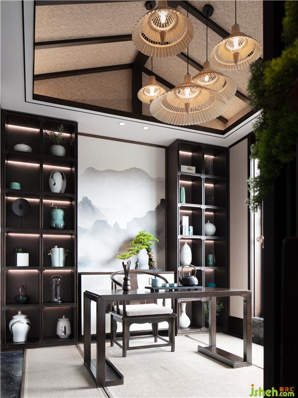 硬裝布局以非常精確的比例關系來描繪生活態(tài)度至上,開放式餐廳與茶席,也瞬間拉近了心理上的距離,傳統(tǒng)的中式餐桌椅,搭配飽含東方韻味的圓形水墨畫,以及棉麻的桌墊與盆景茶具,人文墨客推杯換盞的隱居生活畫面,悠然而愜意!