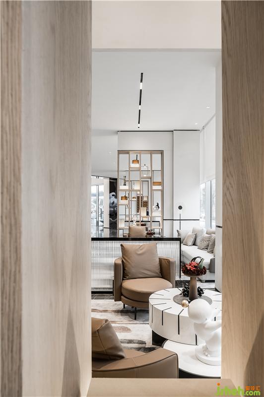空間中的每一個功能區(qū),都折射了設(shè)計視角的轉(zhuǎn)移與變換。通過營銷場景一天的生活情境路線,基于當下的審美趨向、當代的藝術(shù)手法賦予文化以新的呼吸。設(shè)計強調(diào)對結(jié)構(gòu)的解構(gòu),洽談區(qū)呼應(yīng)的玻璃隔斷,室內(nèi)園林的意境,一棵放眼可看見的樹,吹泡泡的孩子雕塑,永生青苔裝置,在天花、墻體與隔斷等構(gòu)件之間營造記憶點,重慶售樓處設(shè)計圍合出一個極簡而秩序井然的空間,加之多處氛圍燈光與陽光的點染,空間內(nèi)陣列更顯意境氤氳。