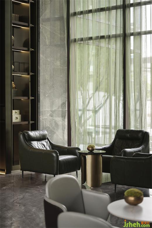 水墨屏風(fēng)裝置的設(shè)計,是大堂的一大亮點,營銷中心設(shè)計不僅將空間做了一個完美分割,還增強了空間層次感。