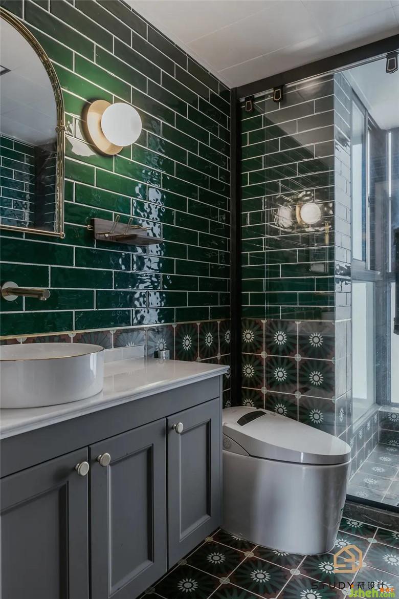 衛(wèi)生間沿襲了外部的氛圍,復(fù)古質(zhì)感低調(diào)流露,拱形銅鏡精致的線條,金色光澤克制而優(yōu)雅,鏡前燈柔和的光影間,收獲你笑起來(lái)的模樣。
