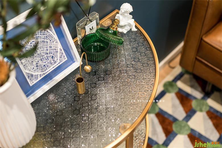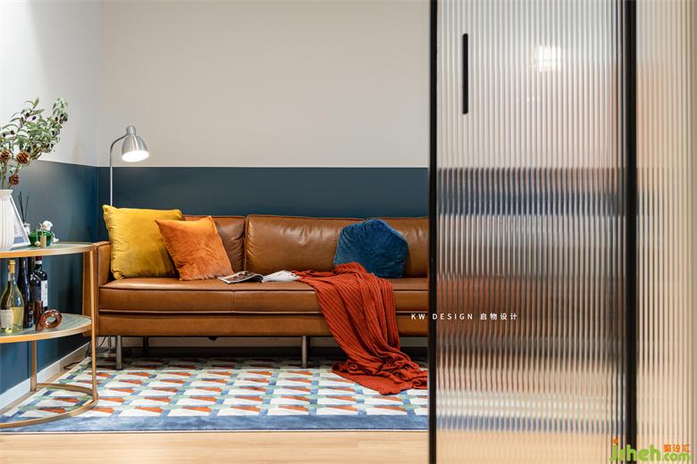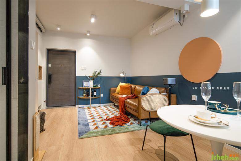 北歐表情的棕色沙發(fā)搭配落地銀色銅燈,精致唯美。家裝設(shè)計拼色幾何地毯幾乎搭上了客餐廳空間的所有色系,仿佛一個集大成者。墻面蔚藍色半墻浮上圓形橙色色塊,不禁讓人聯(lián)想到蔚藍的海面,燃燒似火,懸浮其上的落日,浪漫愜意。創(chuàng)意給空間加分。