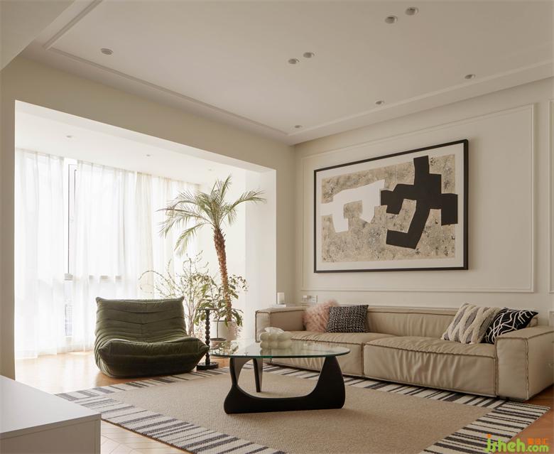 全屋無主燈設計,佳兆業(yè)悅峰復式裝修設計通鋪人字拼地板,簡單的對稱結構裝飾奶白立面,豐富的軟裝配飾元素融合在中性柔和的大基調里,打造兼具功能與審美的獨特家。