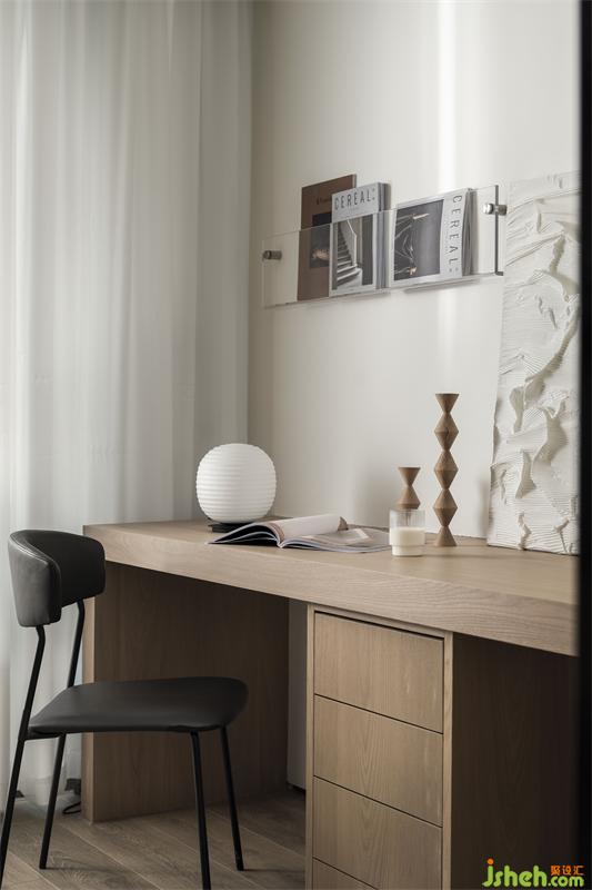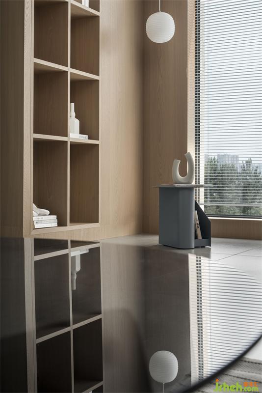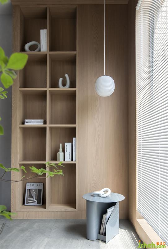 通過書房陽臺和走廊的玻璃推拉門保證廚房的采光,同樣以白墻、玻璃、原木3種元素保證基調(diào)的統(tǒng)一。開放式置物架既是書籍的歸處恰好也變成了貓咪們喜愛活動的空間。