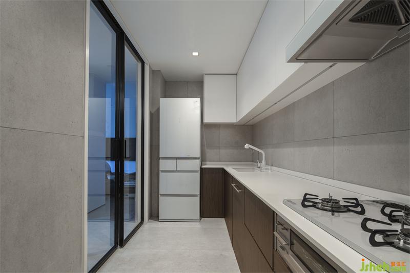 原始狹長型廚房可以算是毫無采光,因此選擇通透性較強(qiáng)的材質(zhì)和提升亮度的白色作為空間主旋律。