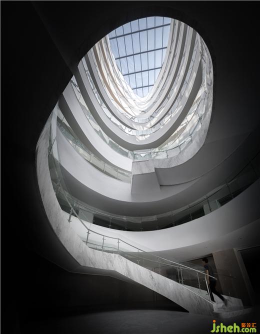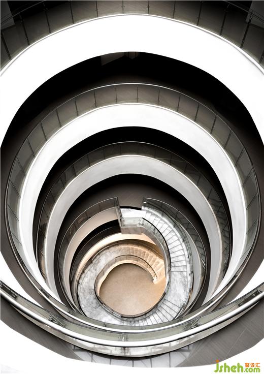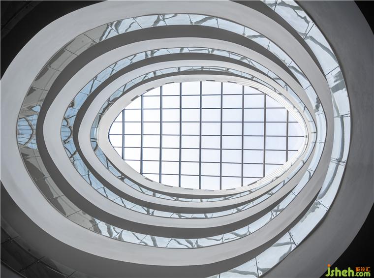 研發(fā)中心設(shè)計不同于傳統(tǒng)方方正正的中庭樣式,建筑的中庭空間由數(shù)個不規(guī)則圓形盤旋錯落而成。中庭將自然光引入每一樓層的圓環(huán)中,帶給人一種自然舒適的感覺。這種舒適感引導(dǎo)人們在中庭聚集,讓人們在開敞空間中交流互動。中庭打破了樓層間的間隔,使整個建筑是交互的、流動的。設(shè)計師大膽的將獨(dú)特的幾何元素運(yùn)用于中庭,使其顯得時尚而自然,更是“方”“圓”組合的內(nèi)化。設(shè)計師希望中庭的“圓”與該建筑整體的方形形成鮮明對比,以延續(xù)“方”“圓”調(diào)和的理念。在建筑物中以仰視視角觀察中庭,天圓地方的陰陽調(diào)和觀念更是讓人深有其感。
