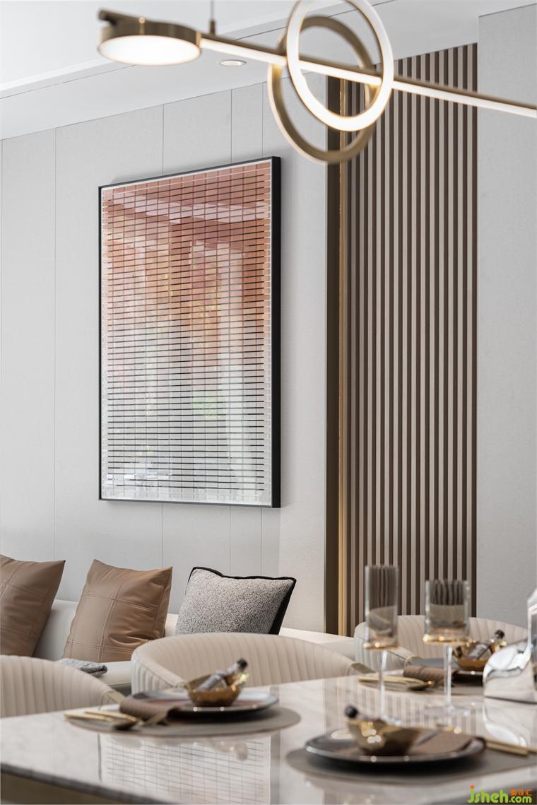 客廳、餐廳、西式廚房一體化設(shè)計(jì),空間通透而舒展,樣板間設(shè)計(jì)相鄰空間既可自由互動(dòng)又彼此獨(dú)立。皮質(zhì)、金屬、石材,不同的材質(zhì)肌理達(dá)成視覺(jué)與觸覺(jué)的精致和諧,于低調(diào)內(nèi)斂中展現(xiàn)生活的質(zhì)感與優(yōu)雅。簡(jiǎn)約格調(diào)的墻面掛畫為空間增添一份藝術(shù)的氣息,同時(shí)也為空間注入一份精神內(nèi)涵。