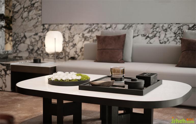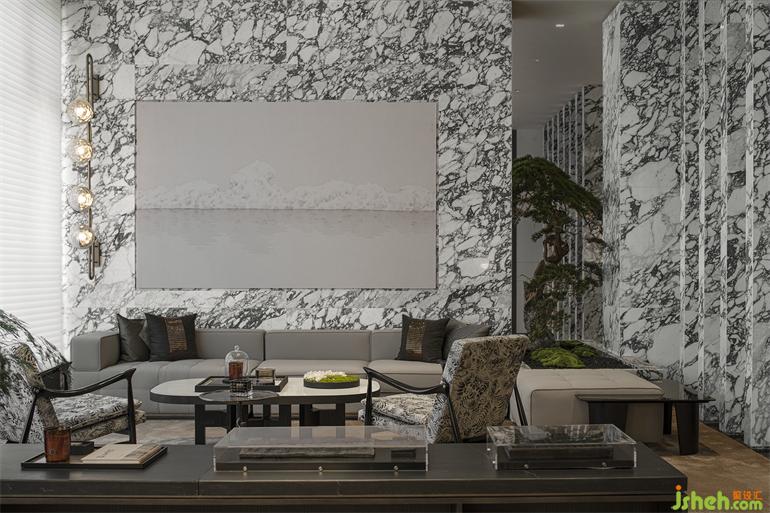 美學館設(shè)計所運用的材質(zhì)則兼具了自然的質(zhì)樸與人工巧思。紋理如畫的大理石和觸感親切的木飾面都被現(xiàn)代設(shè)計手法予以演繹,而金屬、玻璃等現(xiàn)代性強烈的材料則轉(zhuǎn)而輕盈表達,碰撞出當下的時代音符。在這樣充滿東方雅意的現(xiàn)代雅集生活空間中,心甘情愿進入這風雅與風骨并存、傳統(tǒng)跟當代同行的揚州居夢。