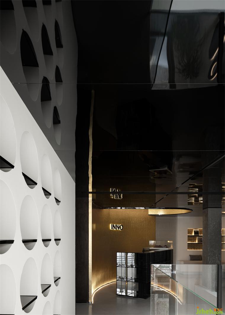 二樓的接待區(qū),是一次“無中生有”的再創(chuàng)。酒店設(shè)計(jì)封閉的墻體在切割重塑后,解放了一整片被束縛的全新空間。黑色鏡面鋪就的天花板弱化了視覺邊界,給予人因黑而淺的戲劇性的錯(cuò)覺感。