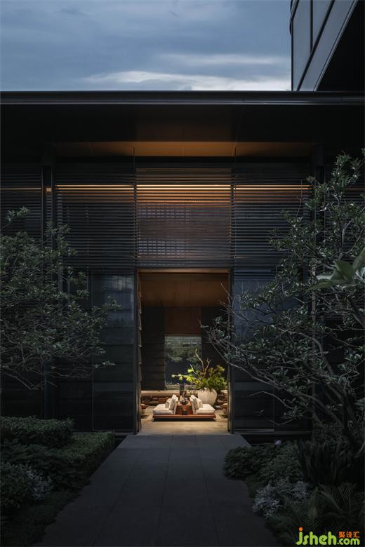 “竹”被解構(gòu)再重組,自下而上傾斜生長(zhǎng),售樓處設(shè)計(jì)將竹子柔韌的流動(dòng)狀態(tài),轉(zhuǎn)譯為現(xiàn)代的序列感,成為東方文化中堅(jiān)韌不拔、節(jié)節(jié)向上的精神隱喻。光透竹隙,時(shí)移景遷,虛實(shí)間光影變幻。伴隨涌泉裝置的水聲,視覺(jué)、聽(tīng)覺(jué)、觸覺(jué)、嗅覺(jué)交織于此,帶來(lái)多維的感官體驗(yàn),入口處的藝術(shù)轉(zhuǎn)換廳因此展現(xiàn)強(qiáng)烈的場(chǎng)地感知。