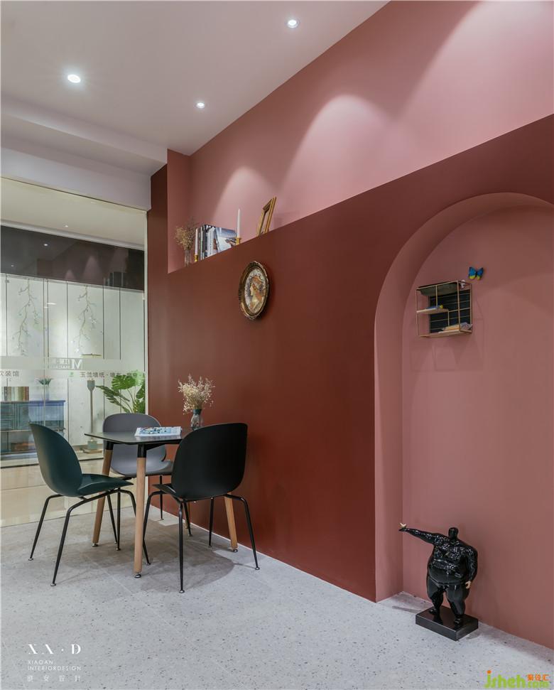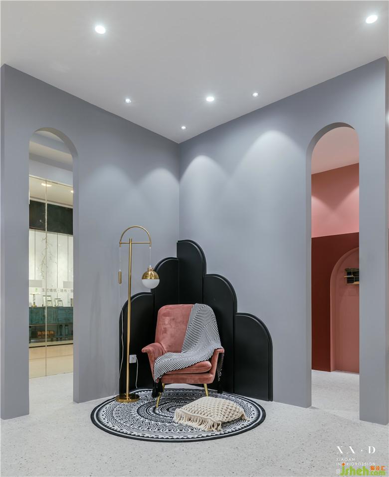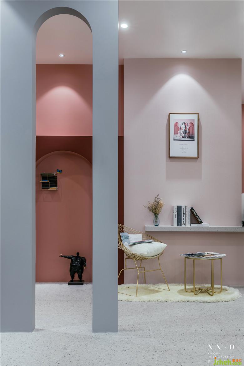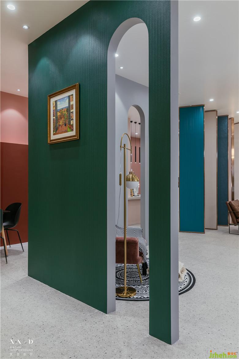 空間的劃分,運(yùn)用多拱門(mén)的方式呈現(xiàn),使得空間的穿透性更具有趣味性?;⌒卧O(shè)計(jì),在空間呈現(xiàn)中更具有建筑語(yǔ)言,透過(guò)弧形門(mén)洞空間看到后面部分的墻面顏色,和前端空間有一個(gè)很好的穿插,使得顏色上有更多的互補(bǔ)和展示。室內(nèi)設(shè)計(jì)師運(yùn)用小景營(yíng)造出更多有意思的空間氛圍。