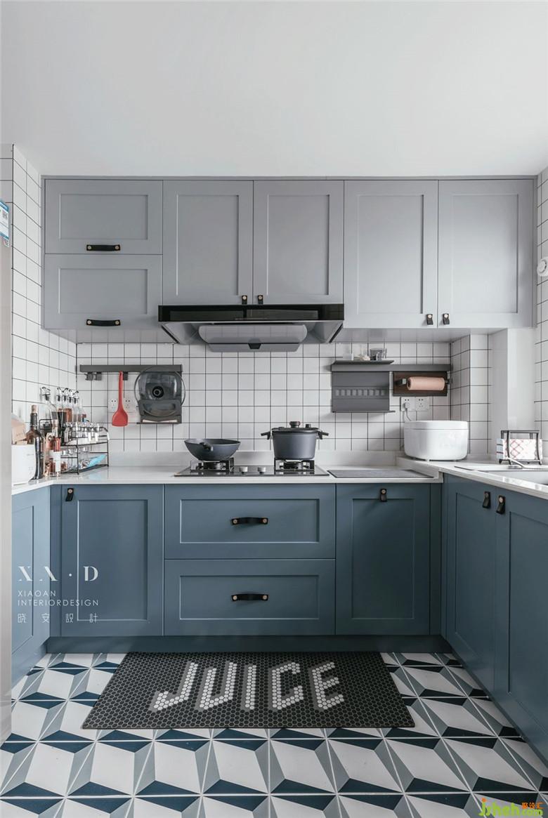 灰藍(lán)色櫥柜線條流暢,有點(diǎn)復(fù)古味道,但花樣獨(dú)特的地磚又帶來(lái)幾分新潮和藝術(shù)美,兩者相交,別有趣味。