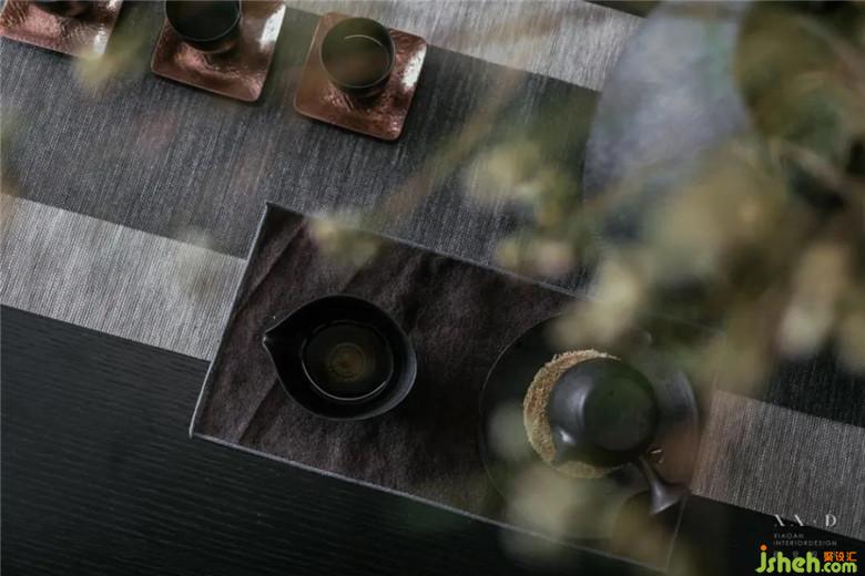 ▲ 餐桌線條簡(jiǎn)單筆直,黑色滲透進(jìn)斑駁的紋理中,顯得更加內(nèi)斂。