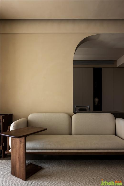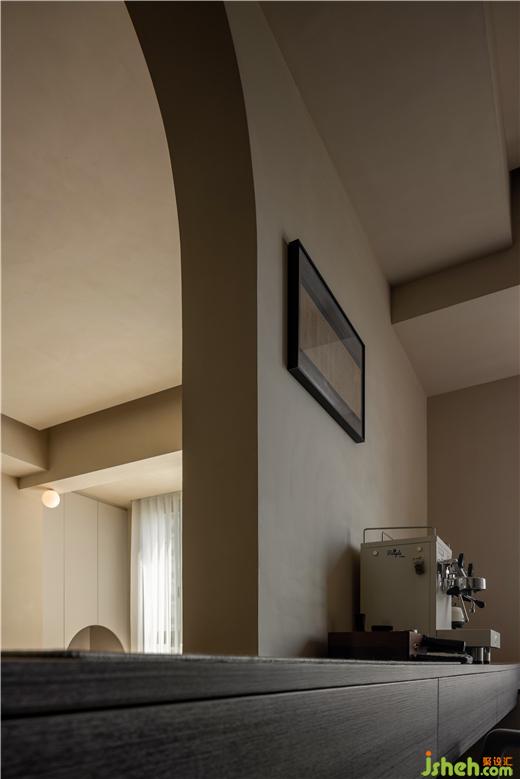 隨直線向上延伸的方向注入倒角形態(tài),一體兩面的構(gòu)造,運河與岸裝修設(shè)計讓人感覺空間既是合圍的又是開放的,空間縱深與線條動勢呈現(xiàn)出書房的靜謐。調(diào)配觀感溫和的大地色系,渲染靜逸自然的氛圍,讓客廳的熱鬧與書房的寧靜共融。