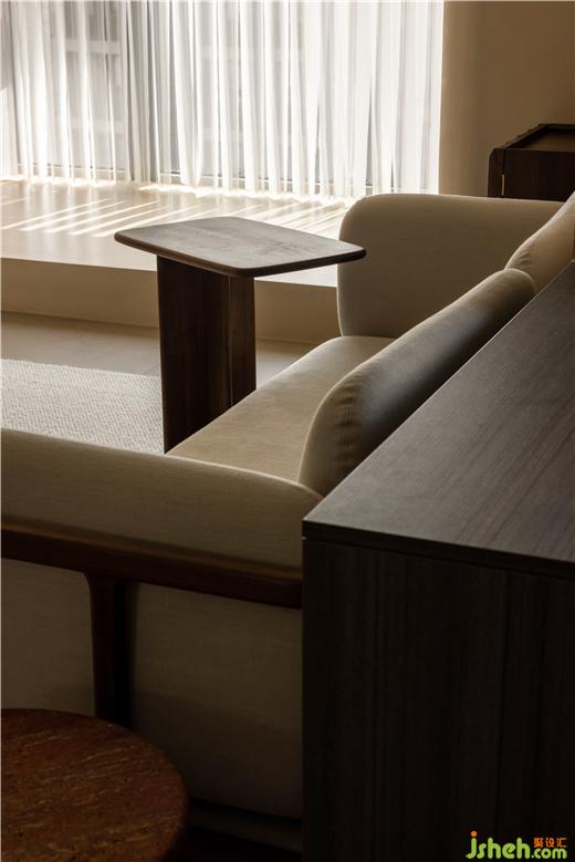 運(yùn)河與岸裝修設(shè)計(jì)以編織紋理模擬水流波動(dòng)的情景,運(yùn)用以深賦淺的藝術(shù)筆法,增強(qiáng)客廳的明朗感。胡桃木色糅合框架結(jié)構(gòu),展開布局的敘事美感,以小巧邊幾補(bǔ)充客廳的功能性,同時(shí)擴(kuò)張了開闊的活動(dòng)空間。
