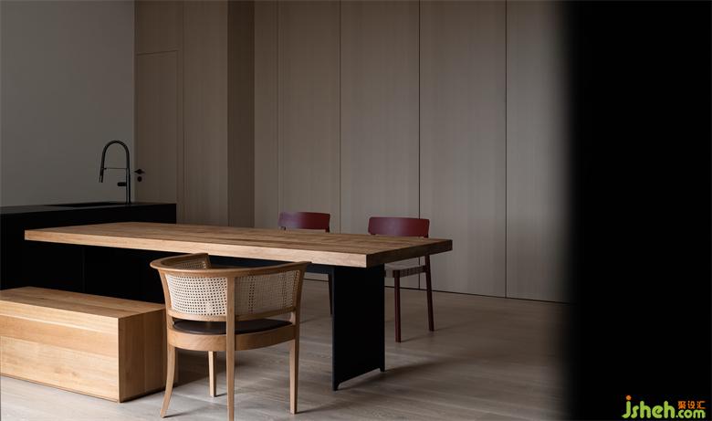 The overall interior design of the residence emphasizes simplicity and comfort. The floor of theliving room and thedining roomare covered withwhite marbles, whichshow simplicity.Walls are clad in large areas ofmilky-white art paint and warm-color wooden veneers, to produce cleanness andthewarm tone of the space. The red glass of the kitchenis ahighlightin thespace,echoing with theredfurniture andredexterior walls, and also giving a sense of comfort and dramatic visual effects. The transparent glass windows on the building facades create harmonious integration between the interiorand thesurrounding outdoorenvironment.In addition, wooden veneers and wooden flooring divide the space into two "boxes"clearly. Theprivacy of the space is enhanced from thepassage.