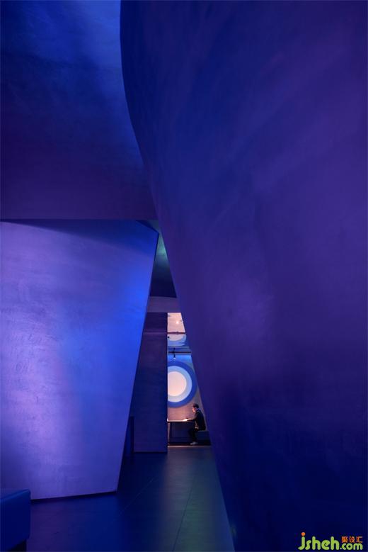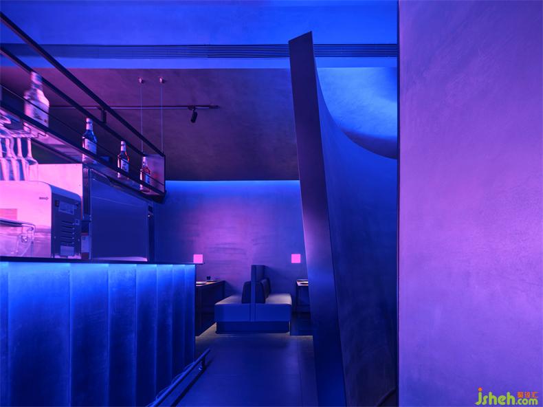 圍合的弧形墻面其意在社交情緒中產(chǎn)生安全的距離感,一方面在給單獨的社交場所以物理形式做出阻隔,另一方面,其物理狀態(tài)下呈現(xiàn)的虛張、力量、與冷調(diào)光影的暈染下,所形成的感知是迷幻的、先鋒的品牌基調(diào)。