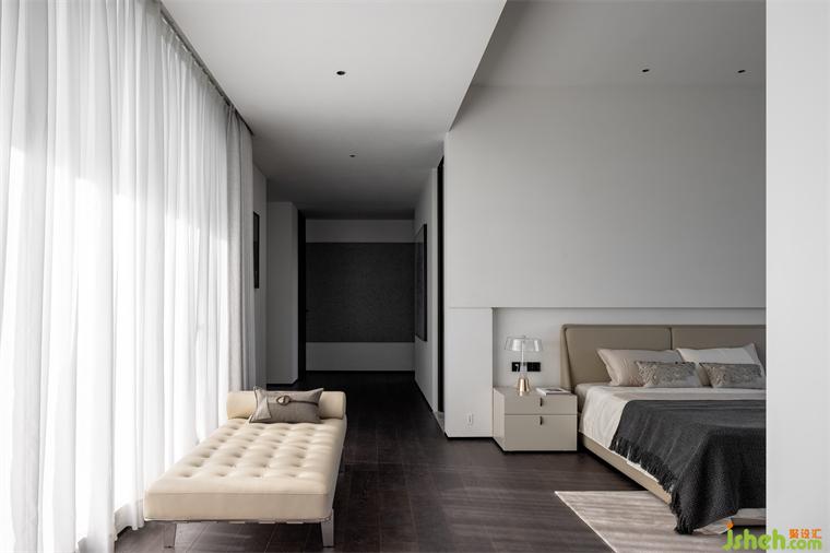 空間的存在靜雅。盡管空間本身體現(xiàn)了設(shè)計(jì)的介入,但和諧與謙遜也是空間中該有的樣子,其表現(xiàn)是克制的。與此同時(shí),這種克制表現(xiàn)在設(shè)計(jì)師的行為本身,極簡豪宅設(shè)計(jì)即給予家的主人更多自己的空間。這是一種非完整的完整狀態(tài),也是有延續(xù)性的趣味。