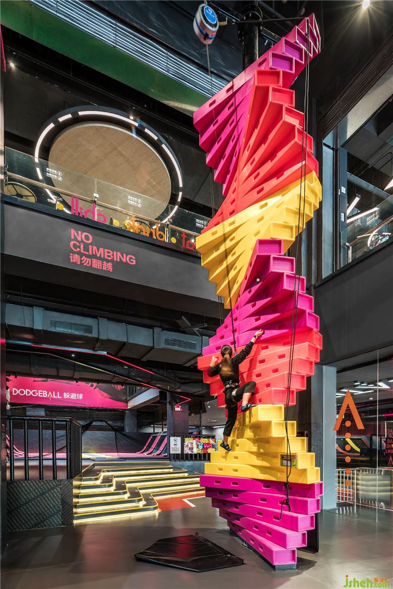 戶外的概念主題呈現(xiàn)在全民運(yùn)動(dòng)的休閑娛樂(lè)場(chǎng)所,室內(nèi)設(shè)計(jì)師將傳統(tǒng)印象中粗獷野性的極限運(yùn)動(dòng),轉(zhuǎn)變?yōu)榫屡c專業(yè)的運(yùn)動(dòng)體驗(yàn),山、水地形元素轉(zhuǎn)換成空間內(nèi)的硬件與情境。4F區(qū)域整合蹦床、滑索、攀巖各種戶外運(yùn)動(dòng),打造適合全民運(yùn)動(dòng)的品牌形象,透過(guò)品牌色彩結(jié)合燈光與視覺(jué)符號(hào),以更簡(jiǎn)單的線條、跑道與山陵形狀塑造室內(nèi)的動(dòng)態(tài)感,同時(shí)也兼具社交的功能。