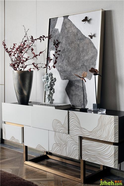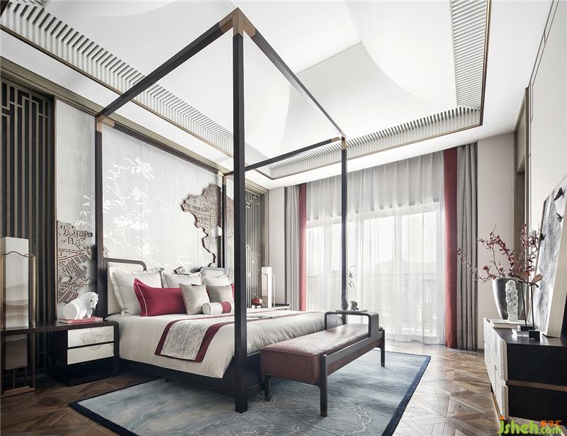 三層主臥的設計靈感來自“莊周夢蝶”,是以灰色調(diào)為主導的色彩呈現(xiàn)。使其成為一種東方的,簡潔的獨特風格。圍幔形天花造型契合建筑形態(tài),輕柔自然,主背景墻山石、花蝶相映成趣,原創(chuàng)家具與燈具自然融入空間,軟硬裝一體化的手法,恰到好處的詮釋了東方生活美學。