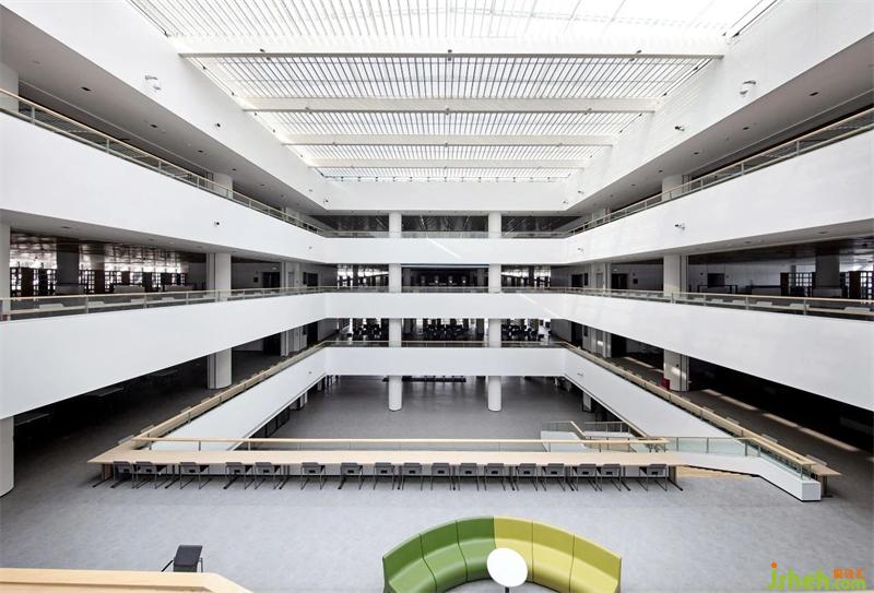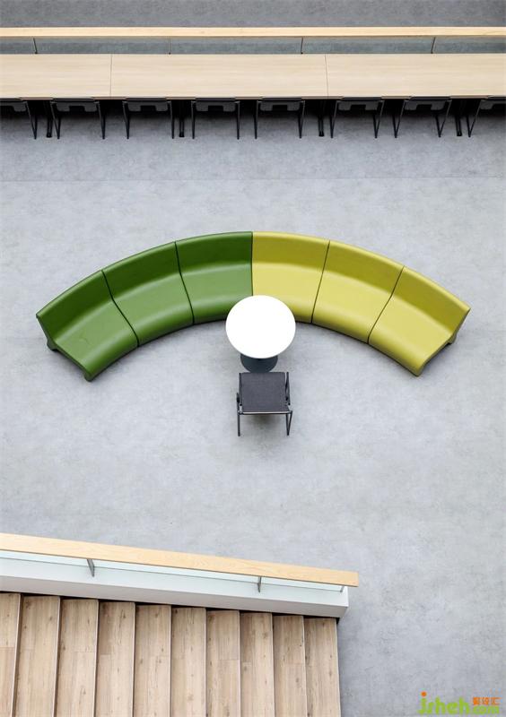 如瀑布般傾瀉的光線灑滿中庭,整體的白色調(diào)中加入柔化空間氛圍的木色,點(diǎn)綴的亮色讓整體穩(wěn)重且不失青春活力,空間氛圍靜謐和諧。師生們可以在靠近中庭周圍體驗(yàn)自然親切、舒適的閱覽氛圍。