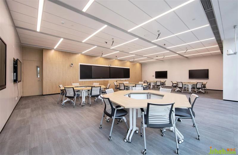 走進(jìn)智慧教室,數(shù)字化屏幕映入眼簾,組合搭配的課桌椅,使交流學(xué)習(xí)更加便捷高效。富有溫暖觸感的木飾面和地毯,提升了空間自然簡約與科技感的和諧氛圍。