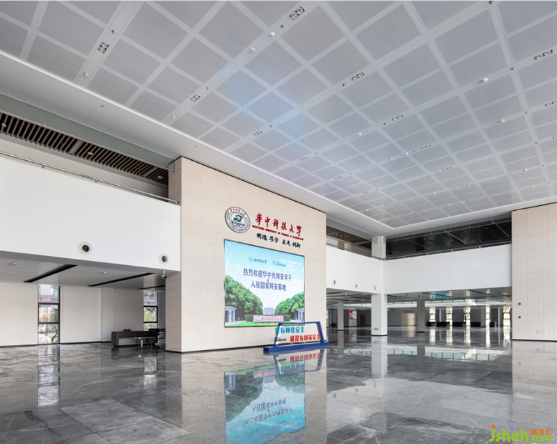 大廳空間運(yùn)用體塊組合的原則,以主背景墻為中心體塊,兩側(cè)空間體塊呼應(yīng)、延伸,形成簡潔、整體的視覺感受;頂面采用經(jīng)過詳盡計(jì)算的微孔鋁板造型,在功能和形式上都遵循統(tǒng)一的空間設(shè)計(jì)語言。