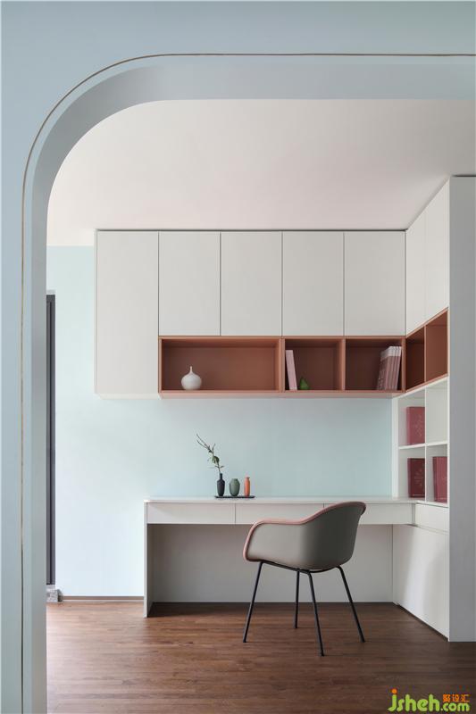 女兒套房包括臥室與書房。書房沒有過多的裝飾,去繁從簡,使女兒能夠更加專注、安心地投入學(xué)習(xí)之中。窗邊設(shè)置紅色的小沙發(fā),方便女兒可以隨時憑窗閱讀。