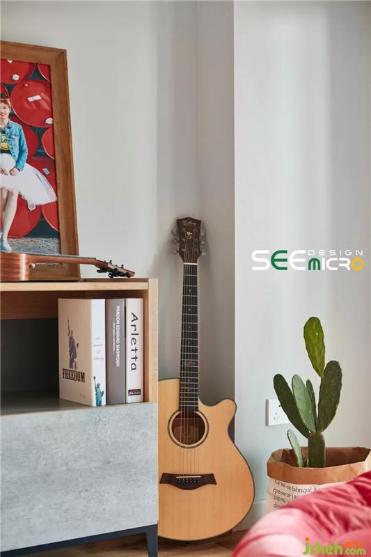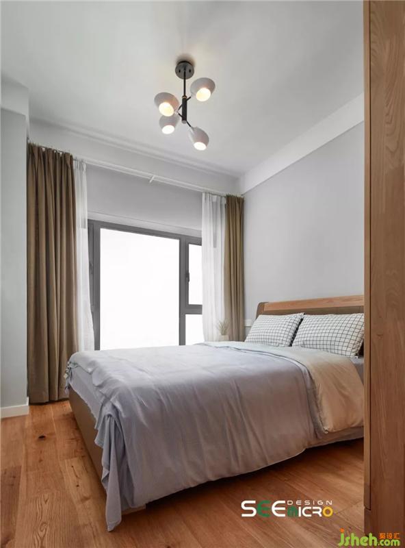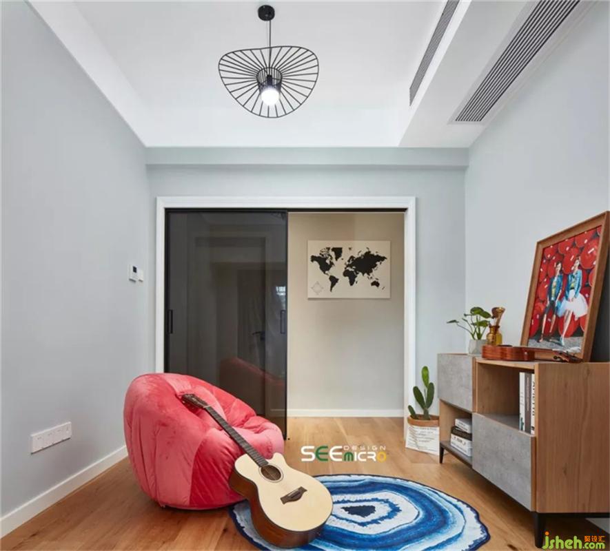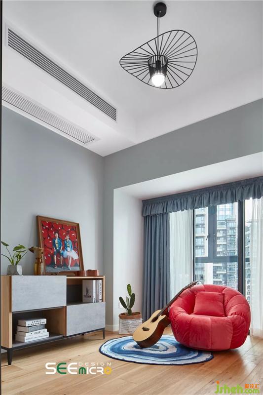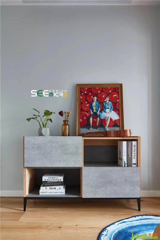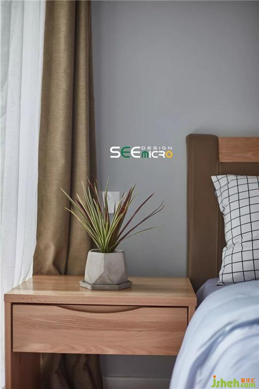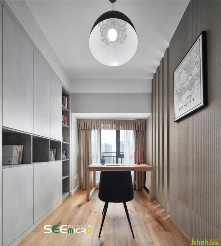 開放式書房的設(shè)計,更具獨特感。同樣是高級灰色調(diào)的書柜,在這里營造的更多是一種安靜、平和的氛圍。屏風設(shè)計采用豎條格柵,不僅有間隔,與主臥有更多靈動,同時又保證通風與采光,原木書桌與整個空間的原木地板相呼應。