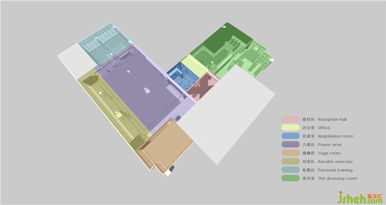 素白色的裸頂,不會(huì)使人壓抑。頂面燈光采用“俗氣”的日光燈管,目的是不會(huì)使躺著的健身者感受刺眼的燈光。大面積的銀鏡和燈箱,拓展空間,“儉樸質(zhì)約”??臻g中一面橙色的玻璃,使空間多了一絲特點(diǎn)與韻味。健身房設(shè)計(jì)