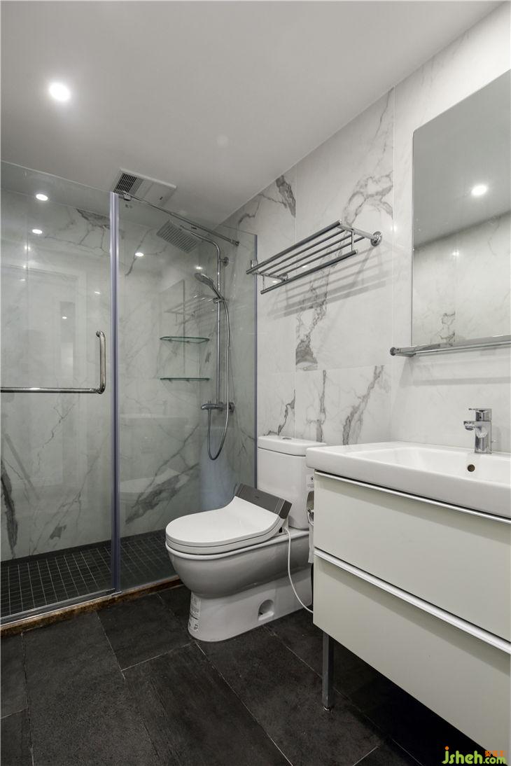 衛(wèi)生間:灰白調(diào)的瓷磚搭配+防水石膏板吊頂,少即是多