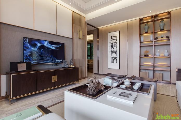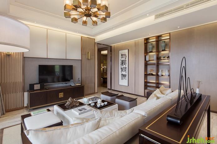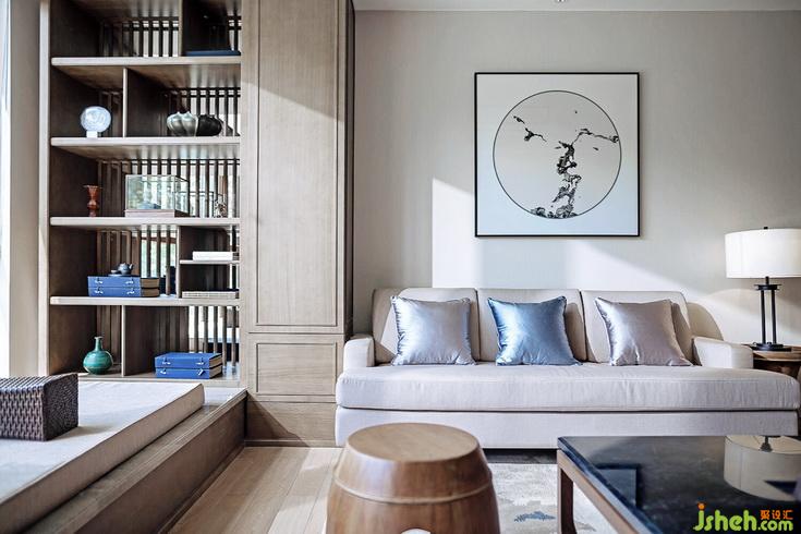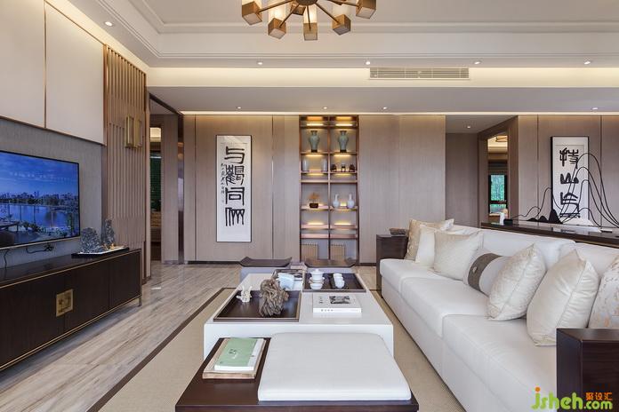 客廳陳列穩(wěn)重簡約的中國式家具,搭配現(xiàn)代布藝沙發(fā),造景以山水屏風(fēng)、陶瓶盆景、燈籠狀的燈具,將禪風(fēng)在新中式空間里演繹,營造出一處富有尊貴感和人文特色的舒適居住空間。