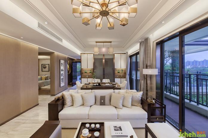 連通的客廳餐廳設(shè)計(jì),顯得更為大氣,為了使空間視覺得到更大的延伸,兩扇寬大的落地窗將戶外優(yōu)美景色偷偷引入到室內(nèi)。山水從來不在遠(yuǎn)方,詩意一直縈繞身邊。設(shè)計(jì)師認(rèn)為,簡約的中式更為符合現(xiàn)代中國人內(nèi)斂含蓄的生活方式,有書香,有茶語,有著深厚文化氛圍與氣息。