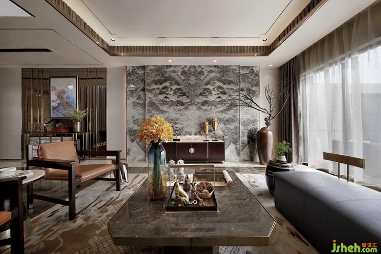 客廳的空間處理簡潔利落,裝飾構(gòu)想?yún)s獨(dú)具匠心,細(xì)節(jié)精致考究。一邊墨線恣意縱橫,見山巒疊嶂,江河流淌,墨色層層暈染,似云煙,似雨霧,充盈于天地之間。這整面墻的水墨意境氣勢(shì)磅礴,自然天成。