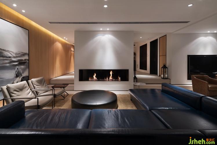 下沉式的客廳空間設(shè)計(jì)是這個(gè)戶型的特點(diǎn)。設(shè)計(jì)師希望公共空間更通透,更流動(dòng),會(huì)客廳與餐廳的機(jī)能通過圍繞樓梯設(shè)計(jì)的機(jī)能墻展開。這個(gè)核心筒兼顧了樓梯間,儲(chǔ)藏室,真火壁爐和西式料理臺(tái)的強(qiáng)大功能,反而是四周的墻面釋放出來作為完整的展示舞臺(tái)。